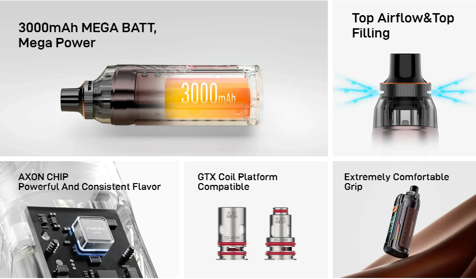 Ce pod est doté des nouvelles cartouches Armour G Series de Vaporesso, embarquant une contenance de 5ml, et fonctionnant à l'aide des populaires résistances GTX. Elles disposent d'un top airflow directement situé à la base de l'embout.