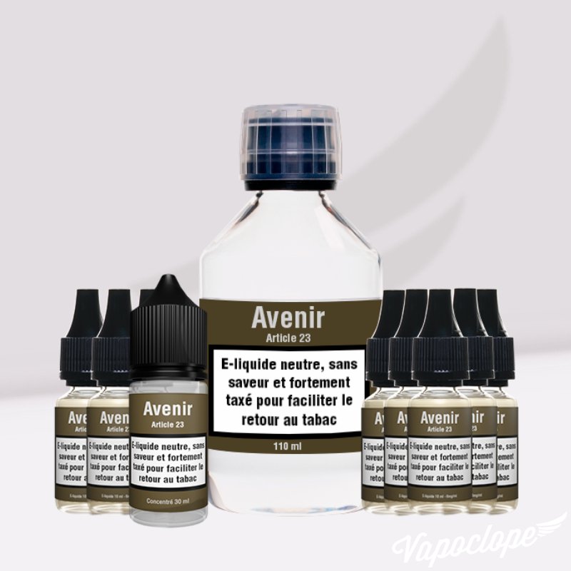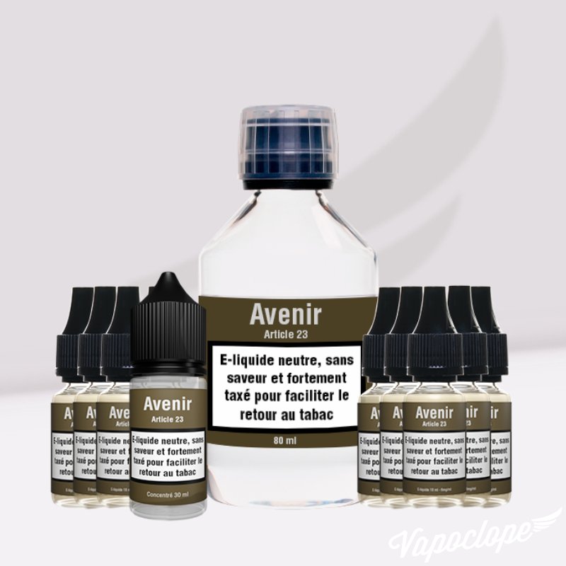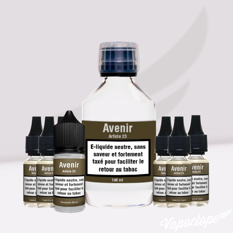 Opter pour un e-liquide Avenir par Article 23, c'est faire le choix d'une méthode plus que douteuse pour se sevrer du tabac ! Une seule et unique saveur Classic bien évidemment, sans oublier un joli paquet neutre et une belle dose de taxes.